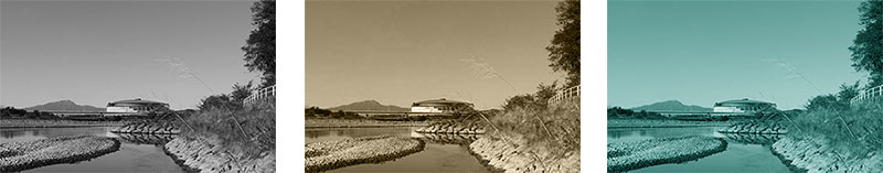 イメージ → 色調補正 → 白黒 (レッド165、イエロー55、グリーン-200、シアン35、ブルー45、マゼンタ60)この状態で着色のチェックボックスをクリックしてカラー設定でアレンジ