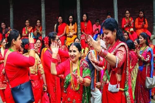 Teej, short for Hartalika Teej, is the fasting festival of women in Nepal. It usually takes place in Nepali Bhadra month (August to September in Solar Calendar) and lasts for three days. Teej Puja is particularly held at Pashupatinath to commemorate the reunion of Goddess Parvati and Lord Shiva. During Teej Festival, Nepalese women will dress in their beautiful red saris, fast to honor Lord Shiva and pray for a happy marriage.